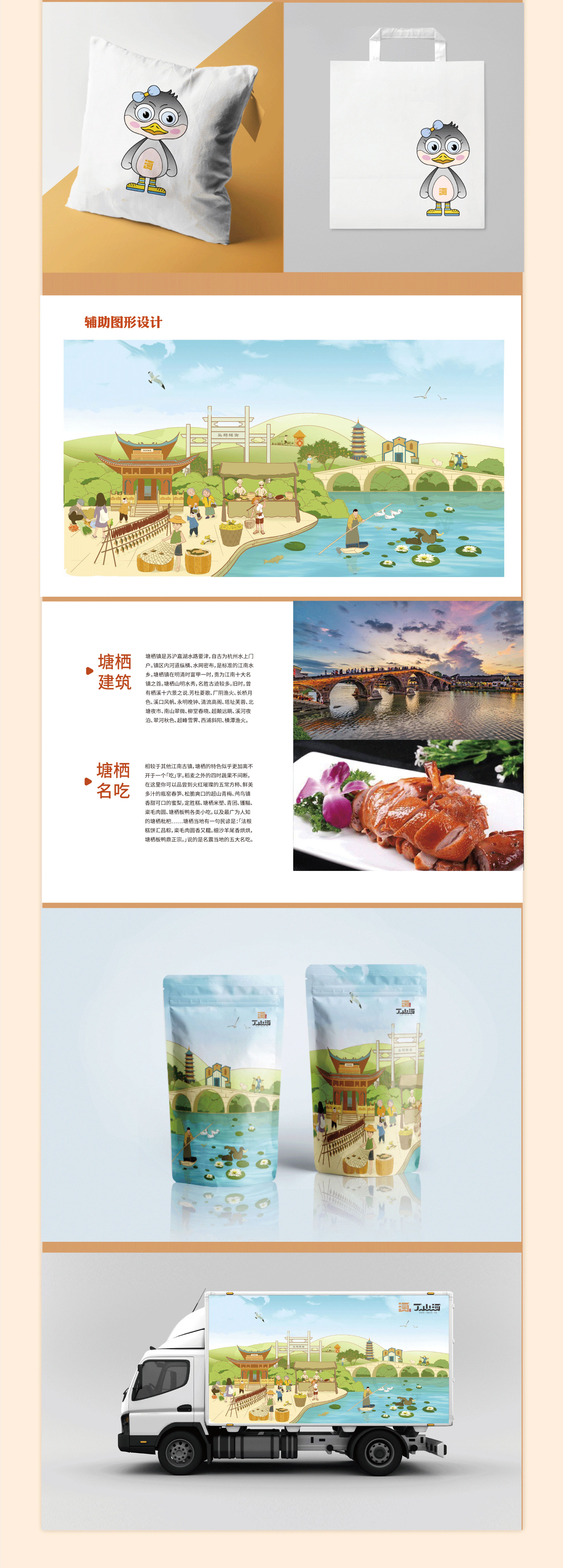 LOGO是消費者認識一個品牌的開端,不僅是品牌視覺傳達要素的核心,也是品牌開展信息傳播的主導力量。結合丁山河的品牌特點,在logo設計時,以“河”為主體,將“丁”“山”二字巧妙融合,組成一個獨特的圖形符號,寓意美好,記憶點明顯;此外,還加入了“廣濟橋”“乾隆御碑”等具有當地特色的符號,展現江南名鎮古韻的特色,地域性鮮明,易于辨認,也有助于將品牌與消費者連接起來,始之成為品牌與受眾的橋梁。同時我們還對其輔助圖形進行了設計,利用原創手繪的形式,將塘棲古鎮的本土建筑、特色進行呈現,展現地方原貌,突出當地特色,進而拉近與消費者的距離,幫助消費者更好的了解品牌。另外,我們還對丁山河的IP進行打造,獲得客戶的認可。
