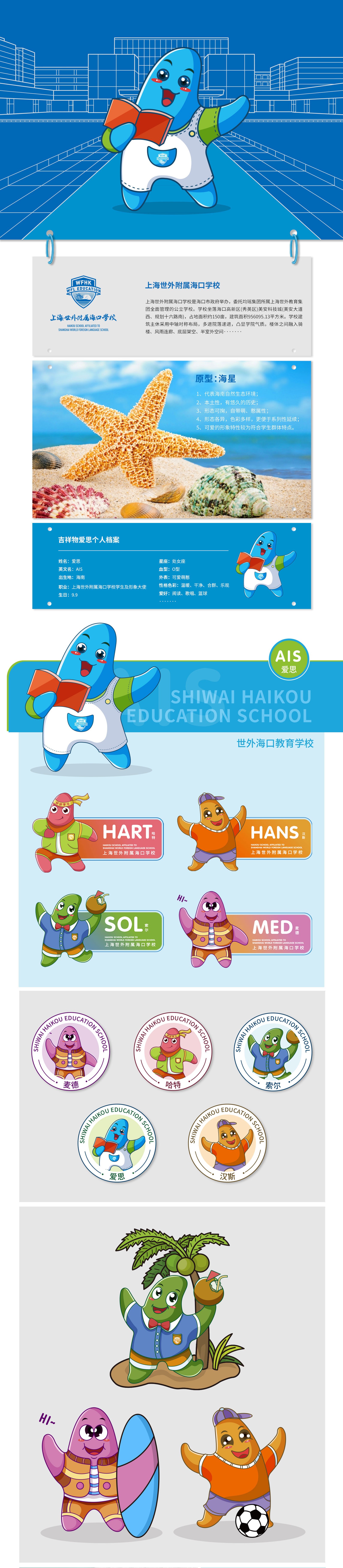 考慮到這所學校位處???,地理位置優越,環境優美,景色宜人,同時作為學校及學生的宣傳大使,需要具備辨識度高、記憶點強的特點?;诖?,石特在對吉祥物進行設計創作時,選取以海星為原型,其不僅能代表海南自然的生態環境,還具有本土性強,歷史悠久的特性;通過對學生群體性格特征及愛好的分析,擬化出自帶萌性的卡通形象,特征明顯極易辨認;吉祥物以系列化的形式進行呈現,整體顏色明亮活潑,其中有熱愛唱歌的“麥穗”,認真學習的“哈特”,樂觀向上的“索爾”,喜歡閱讀的“愛思”以及愛足球運動“漢斯”,它們形態可掬,萌感十足,符合學生群體的特點。本次石特為上海世外附屬??趯W校的吉祥物的成功策劃,得到了客戶的高度認可。