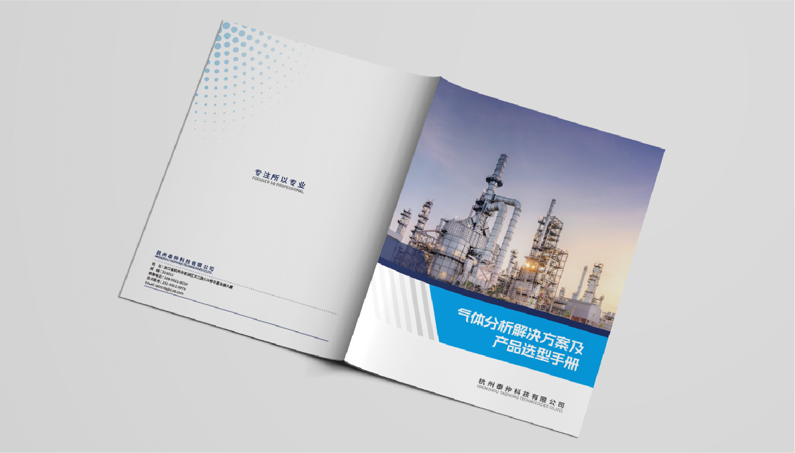 2、宣傳冊的封面選用了一張高清晰度的企業產品圖片,展現了泰仲科技所提供的氣體分析設備和服務,封面簡潔明了。