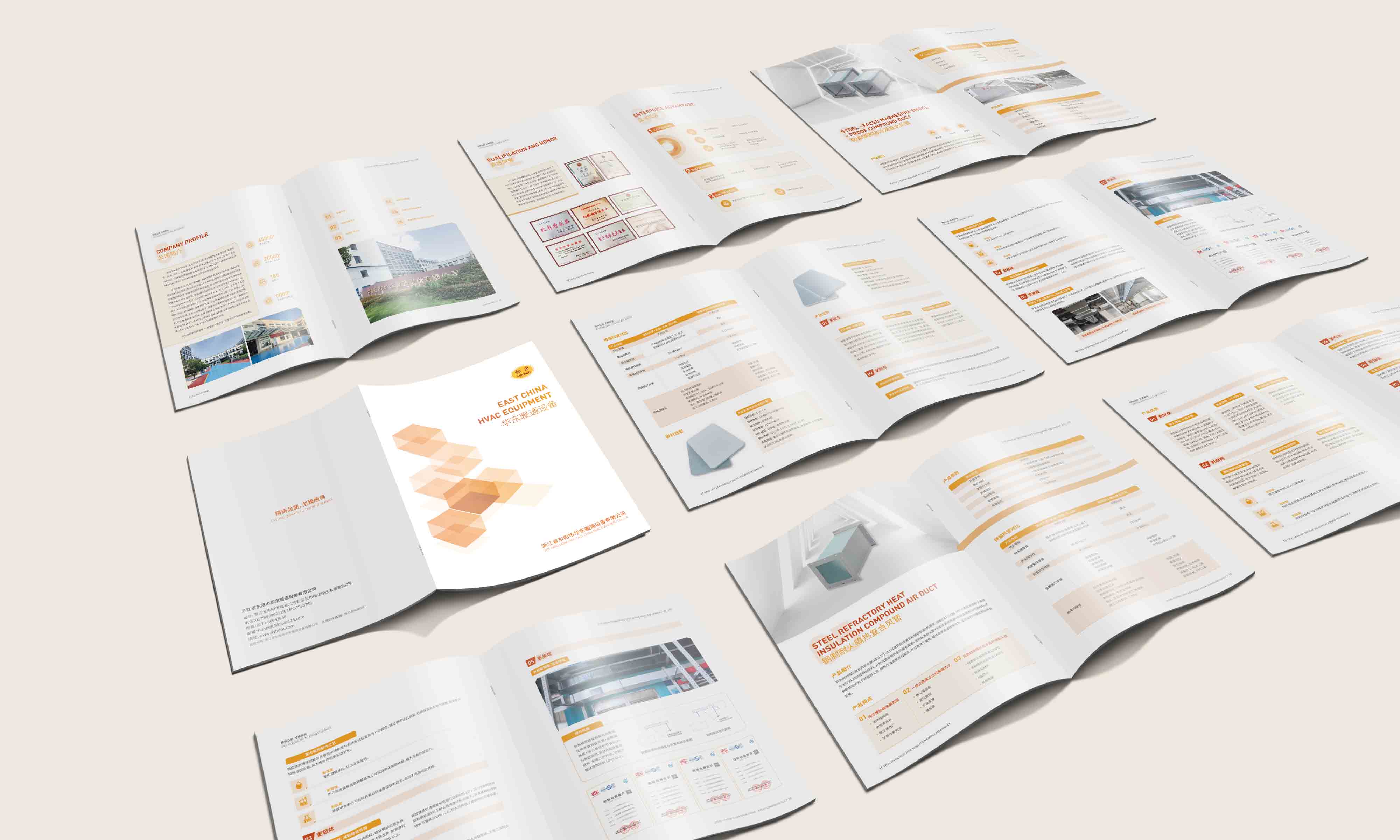 石特從公司概況、產品展示等角度著手設計華東暖通設備公司的產品宣傳冊: