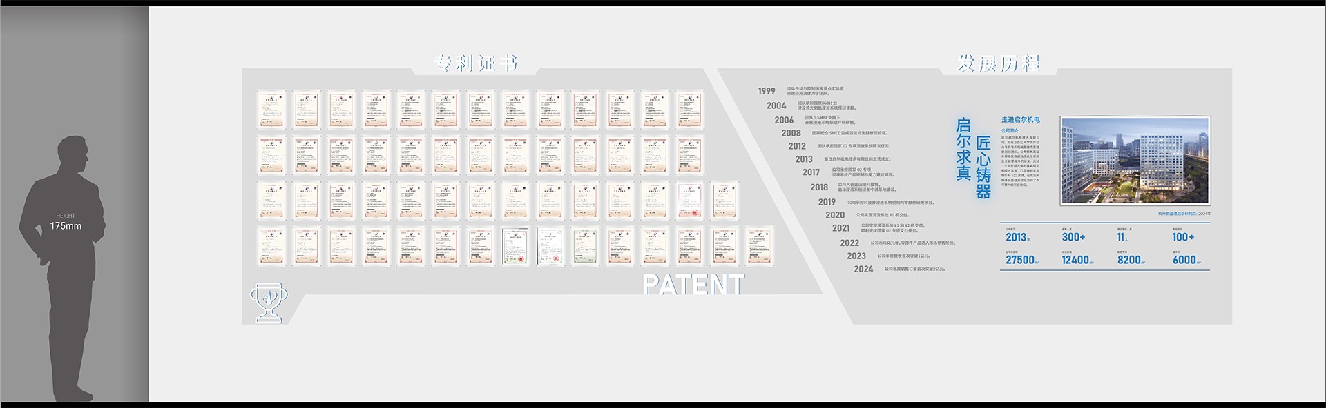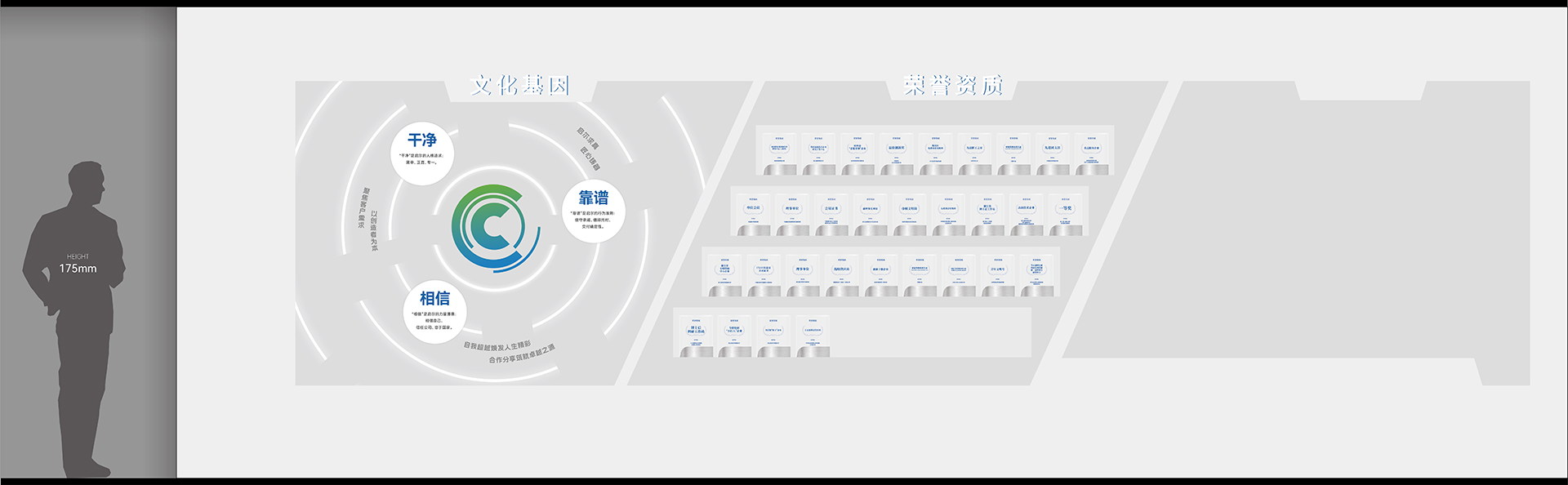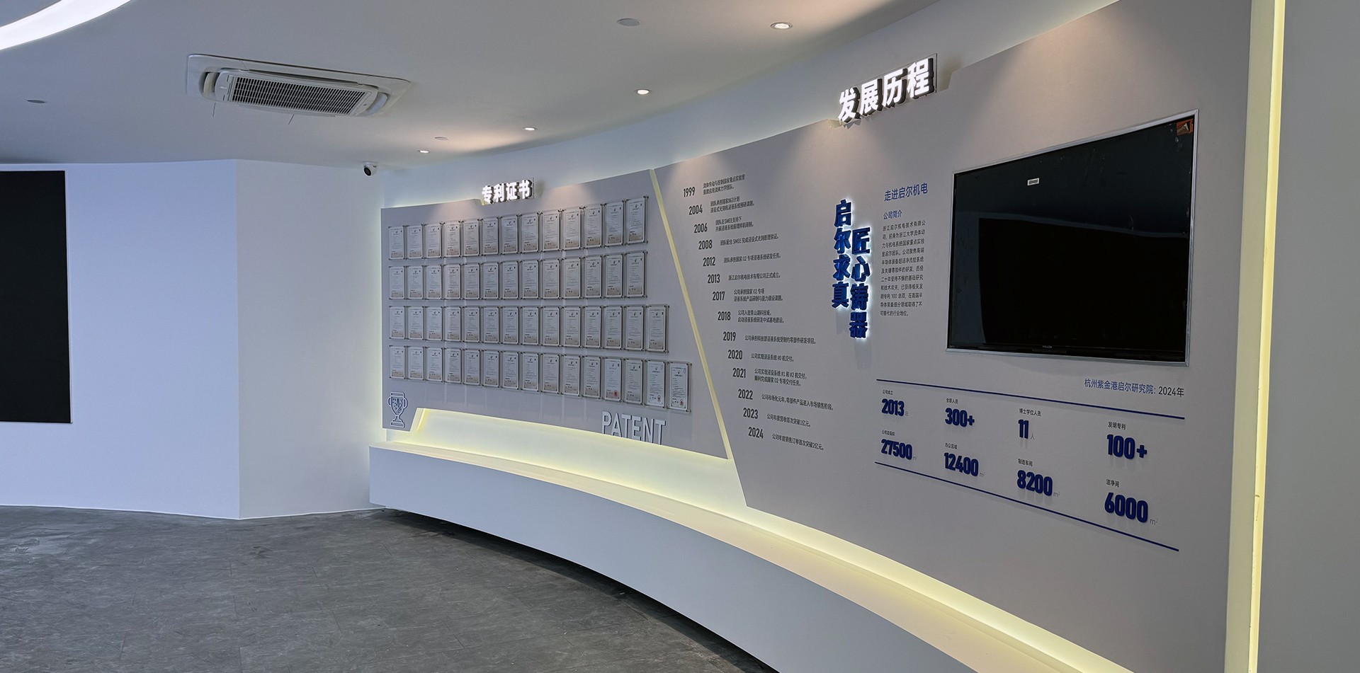 2. 序廳(品牌形象區(qū))設(shè)計(jì)元素:采用高科技感的LED大屏播放公司宣傳片,結(jié)合動(dòng)態(tài)光影效果,營(yíng)造震撼的視覺(jué)效果。墻面設(shè)置企業(yè)形象墻,展示公司歷史沿革、榮譽(yù)獎(jiǎng)項(xiàng)及核心團(tuán)隊(duì)介紹。亮點(diǎn):設(shè)置AR互動(dòng)裝置,參觀者可通過(guò)手機(jī)或特定設(shè)備掃描二維碼,虛擬體驗(yàn)公司發(fā)展歷程中的重要時(shí)刻。