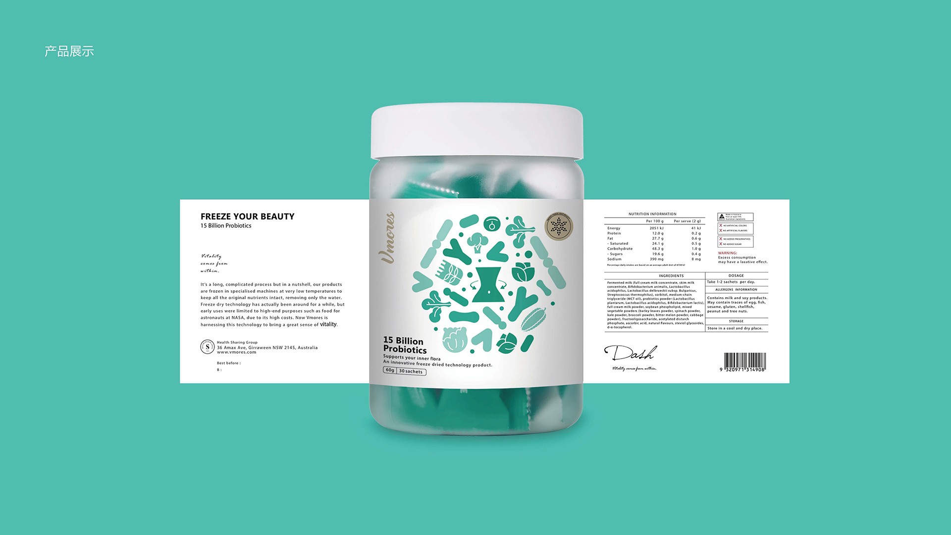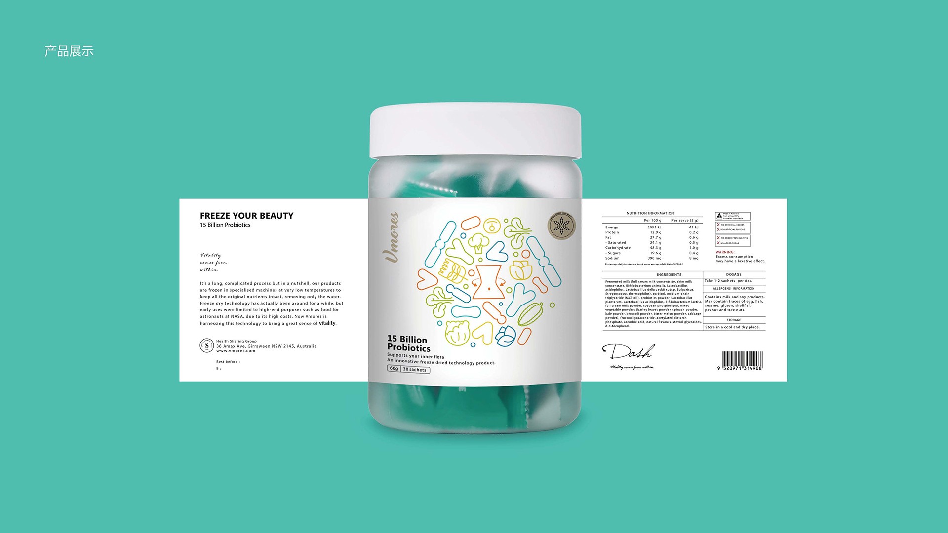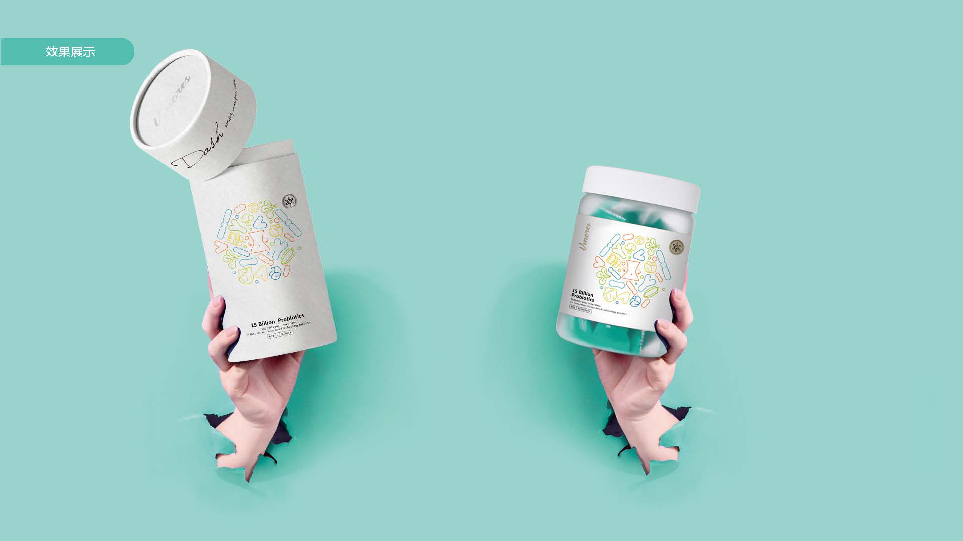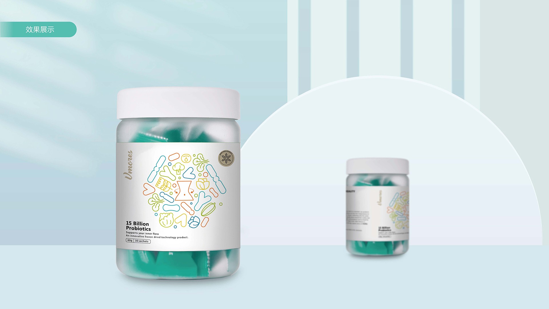 突出150億益生菌,以大額數(shù)字吸引眼球;將數(shù)字設(shè)計(jì)成腸道形狀,表現(xiàn)“瘦子菌”是腸道中的有益菌群,產(chǎn)品有益與腸道的功效;整體使用多彩的漸變色,符合產(chǎn)品調(diào)性及目標(biāo)群眾的審美。此款包裝設(shè)計(jì)將產(chǎn)品效果和成分,以抽象的形式表現(xiàn)出來(lái),插圖中心是瘦身效果,為產(chǎn)品功效,周?chē)侨N有益菌群,六種超級(jí)蔬菜的組合;說(shuō)明產(chǎn)品營(yíng)養(yǎng)健康,配色清新活波,較為年輕化。