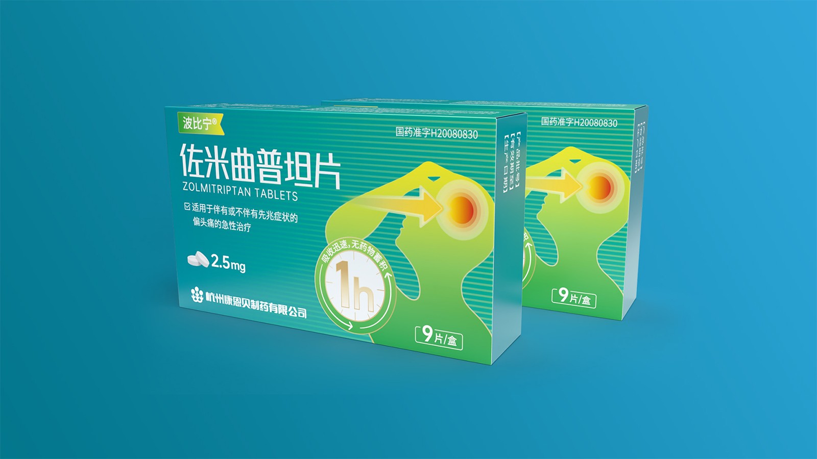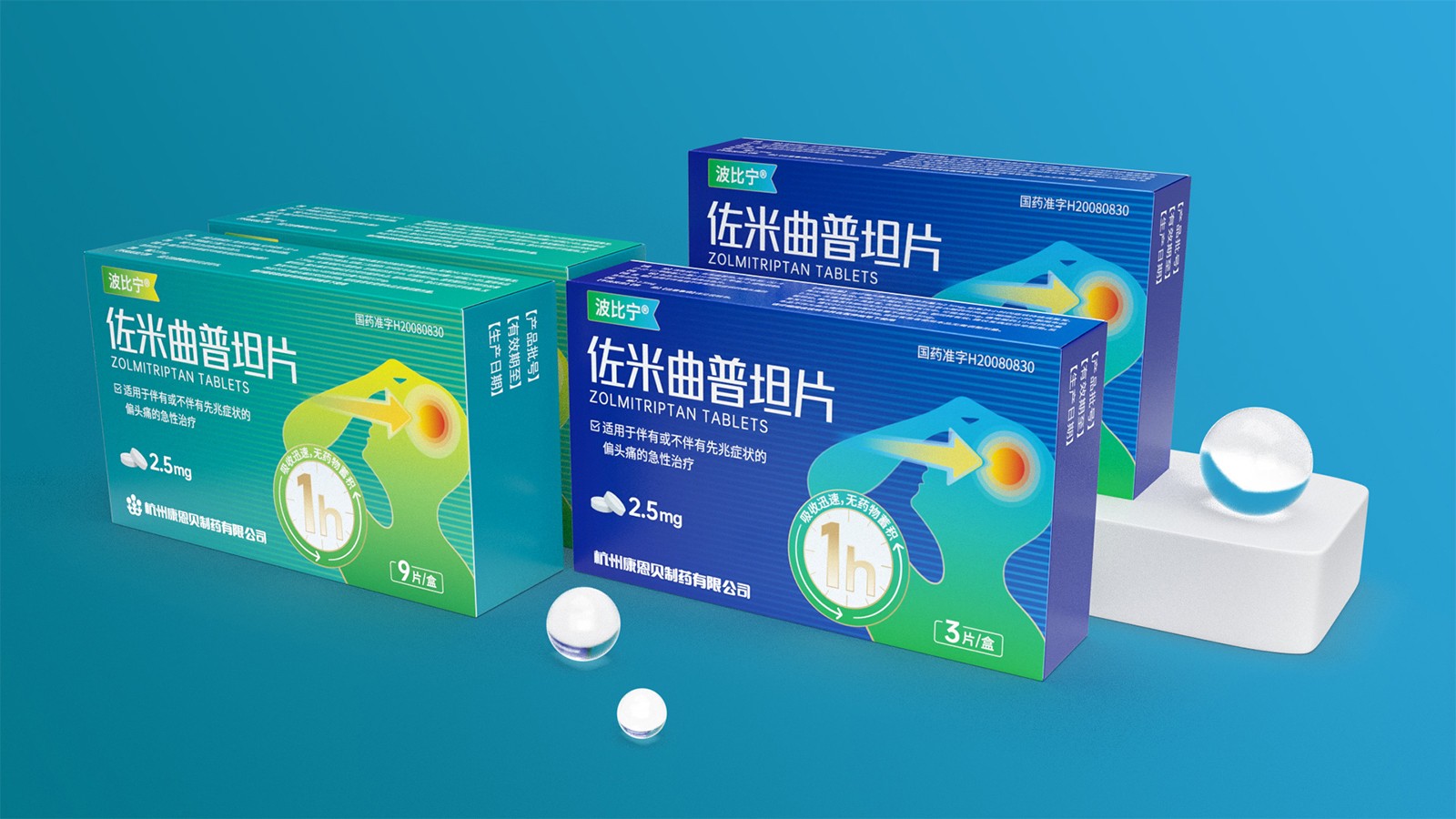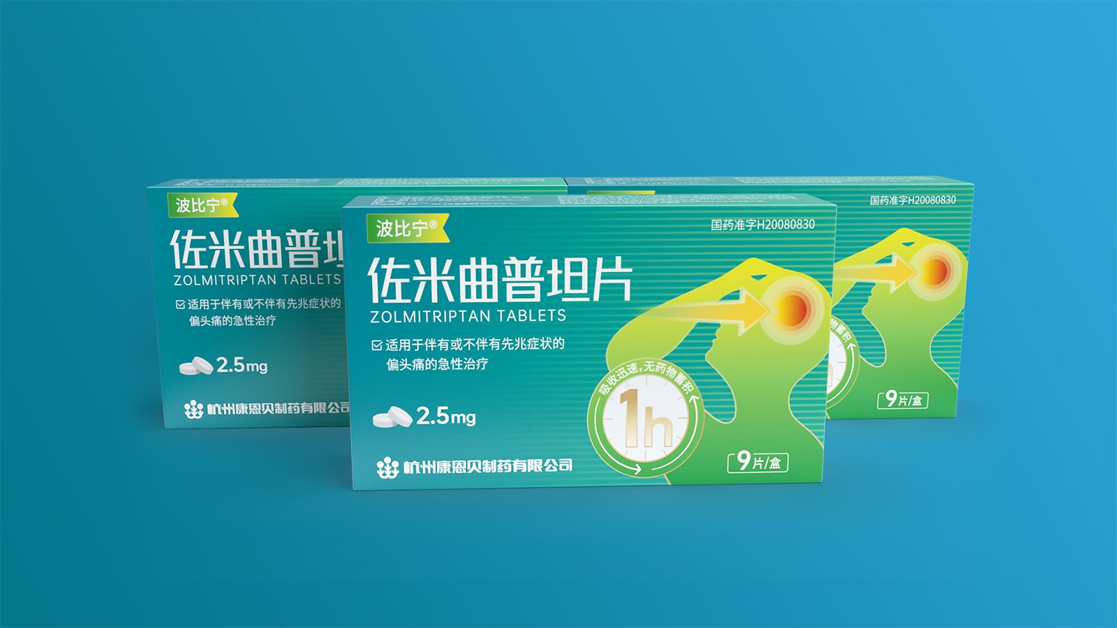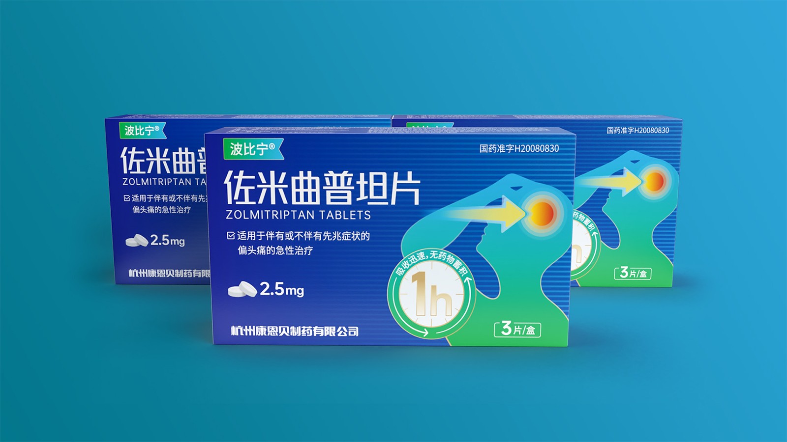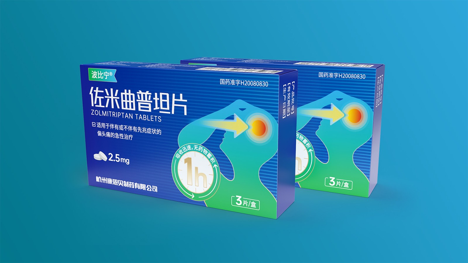 石特綜合考慮產品的使用場景、產品功效、消費者心理等因素并結合創(chuàng)意對藥品的包裝設計提出方案。對于佐米曲普坦片的包裝,以藍色為主色,藍色寓意健康,添加人體頭部剪影并展示頭痛癥狀,可以凸顯藥品的功效,被放大的1h也可以告訴人們該藥品的見效快速