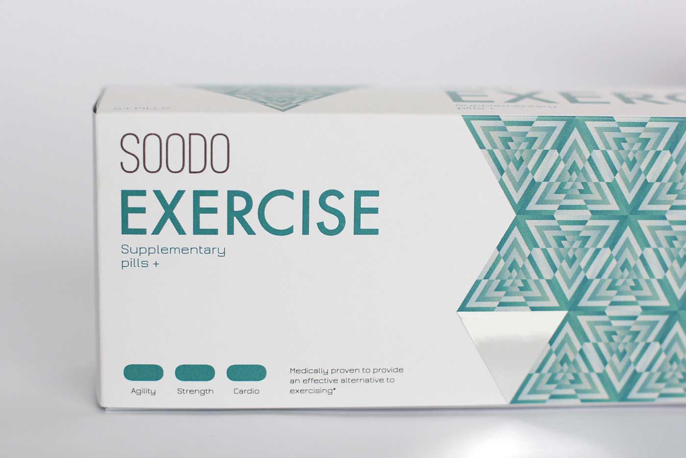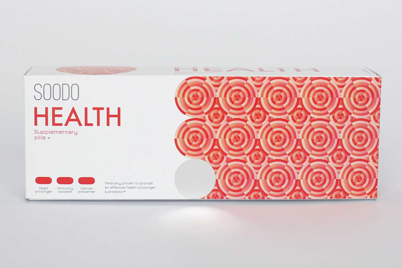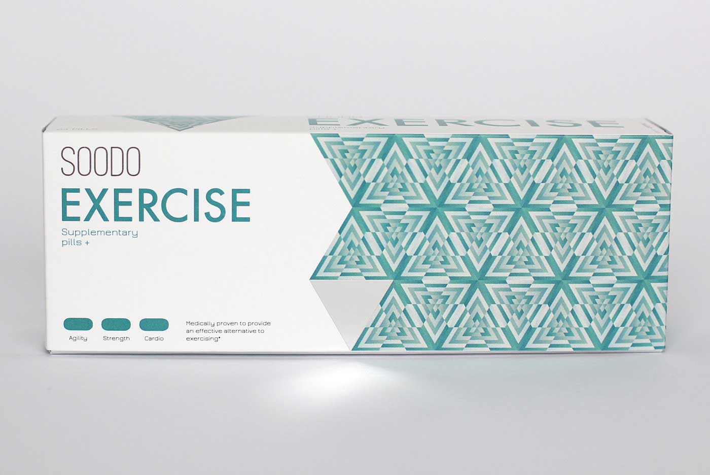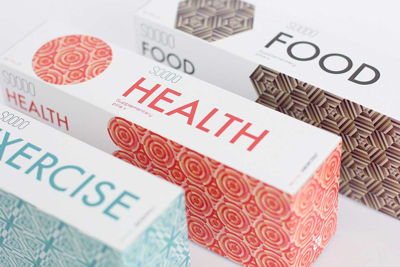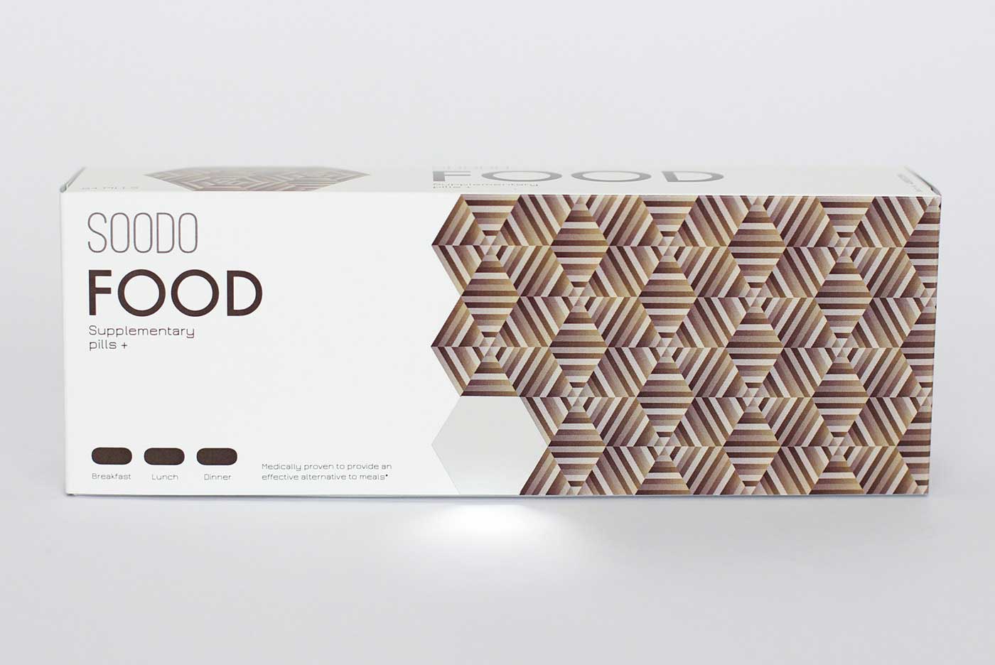 品牌名稱“SOODO”是通過將原始詞“偽”的發(fā)音,即不假的,有誤導性的。消除創(chuàng)造健康生活的所有自然方式的想法,導致失去與這些活動相關的重要的社會互動。我想要設計方法來反映這樣一個悲劇的后果。產(chǎn)品包裝采用幾何圖形進行設計,用漸變的方法使圖案更抽象化,表達補藥對人體產(chǎn)生的微妙變化。